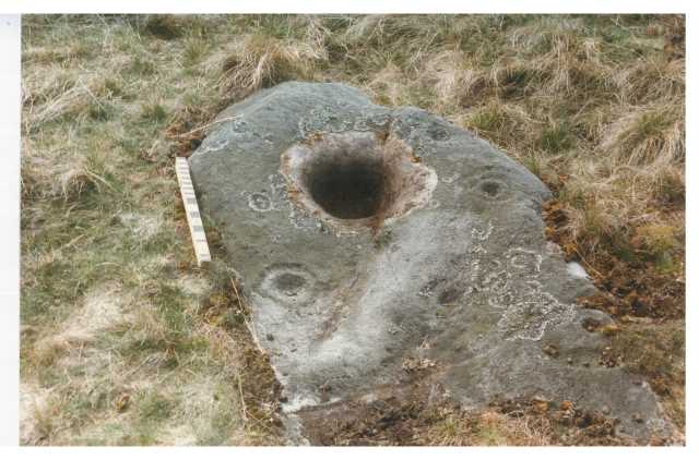 Bronze Age cup and ring marked rock (in situ). The rock is carved with a large pecked 'basin' 0.25m in diameter and over 0.2m deep, a single cup mark and four cup and ring marks (10).