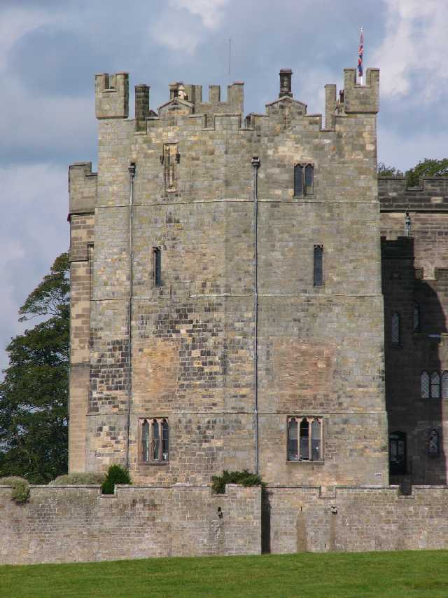 Raby Castle, which does not occupy a defensive position, has been a fortified house since circa 1130. The present castle is of one period and was erected by Ralph Neville in the latter part of the fourteenth century. Raby consists of the main house with towers connected by short walls and a large platform surrounded by a another wall. The southwest tower is Joan's Tower or Duke's Tower, the south east Bulmer's Tower has five sides and is of great strength. The northeast tower is Mount Raskelf, the northwest tower, Clifford's Tower, and the west, the Watch Tower. The chapel in the east face is of circa 1364 - a barbican, now gone, projected from it. The castle was besieged in 1645 when it surrendered to Parliament, and again in 1648 by the Royalists. It was nearly all modernised circa 1848 by Henry, Duke of Cleveland. When Barnard Castle was dismantled in 1630, many of the fittings were taken and incorporated at Raby. Bulmers Tower is said to be of 11th century date and to the west, the Octagon Drawing Room and the Dining Room were erected after 1842. (1)