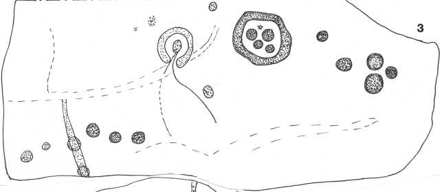 A prehistoric carved rock, partly covered in turf, is situated 170 metres south west of West Loups, Cotherstone Moor. It is on Great Allotment, approximately 23 metres west of the corner of the fence dividing the military Danger Area from Great Allotment. The visible part of the rock measures 2.5 metres by 1 metre by 0.1 metre high. The carving consists of many cups, one with a ring, four cups enclosed by a groove, and several other grooves (3).