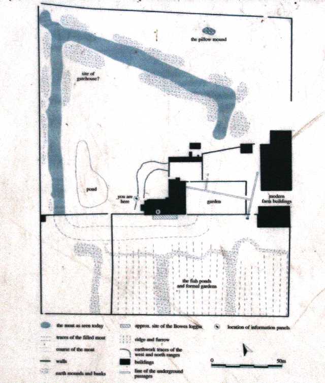 Of the C17 house built over the two eastern vaults of the Medieval building, only fragments of the east and west walls remain. The fortified building appears to have occupied the south angle of an enclosure consisting of two ramparts of earth and stone, with a Medieval ditch which served as a moat.