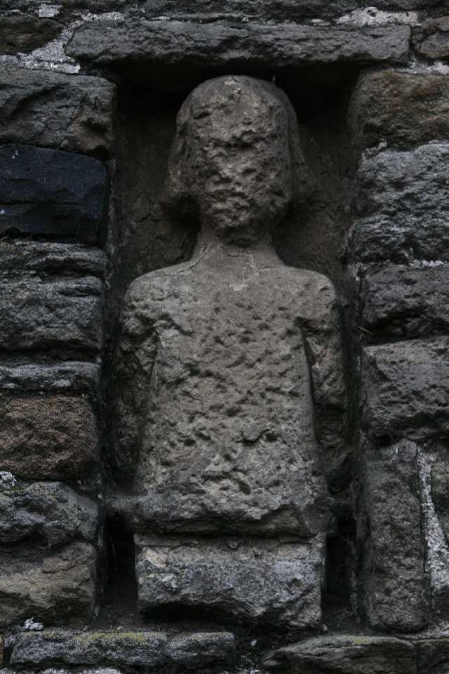 The adjacent northeast block appears to be an C18 addition. The interior west wall of the Medieval structure contains what may be an original fireplace. In the exposed portion of the north wall is a pointed doorway, above which is a square window. West of the doorway are the remains of another opening which passed through the wall at an angle - now blocked. There are two other pointed doorways in the north wall, and traces of a possible third. All are now blocked. There is an ancient fireplace in the east wall.