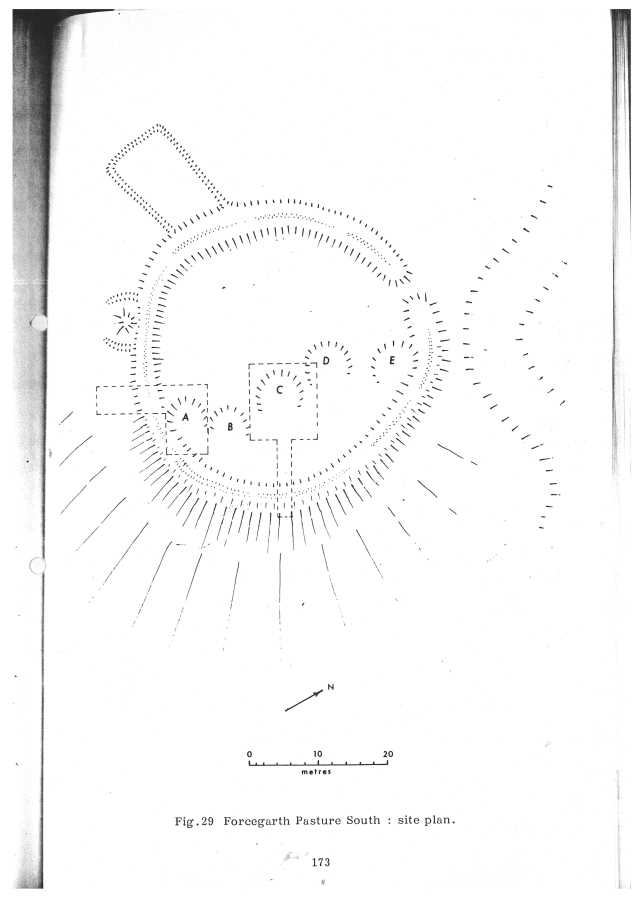 A Romano period native settlement situated at Force Garth, in Upper Teesdale. The settlement occupies a large artificial scoop in the hillside, enclosed by a rubble bank. Inside this enclosure are five small scoops, each about 7 metres in diameter. Excavation has shown that they are the sites of hut circles. Finds from the excavations include spindle whorls, saddle querns and rotary querns, and pottery, including some Roman Samian Ware. Scheduled (17).