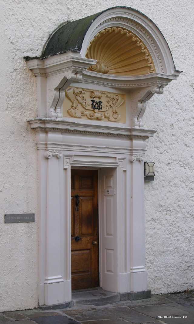 This building, St Cuthbert's Society, was originally built as two separate houses. The right hand house is of 17th century date, but the left hand house is of early 19th century date. This is a Grade II* Listed Building protected by law.