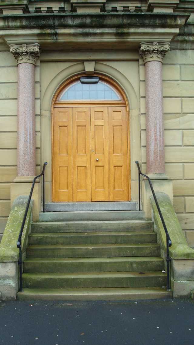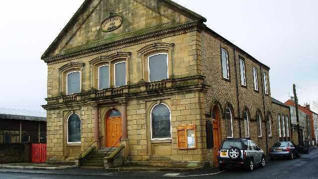 Primitive Methodist Chapel, named and dated 1868 in pediment. Sandstone ashlar with pink granite columns flanking door; Welsh slate roof. Pedimented front of 2 storeys and 3 bays has moulded plinth; chamfered rusticated ground floor. (1)