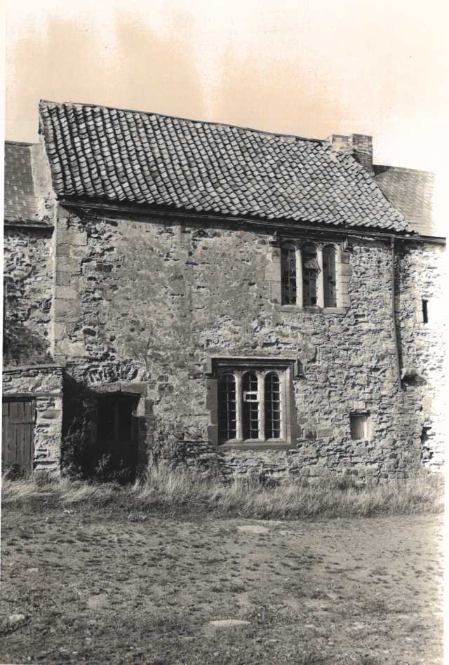 Part of east building showing two Tudor 3 light mullioned windows with label above. Unknown
