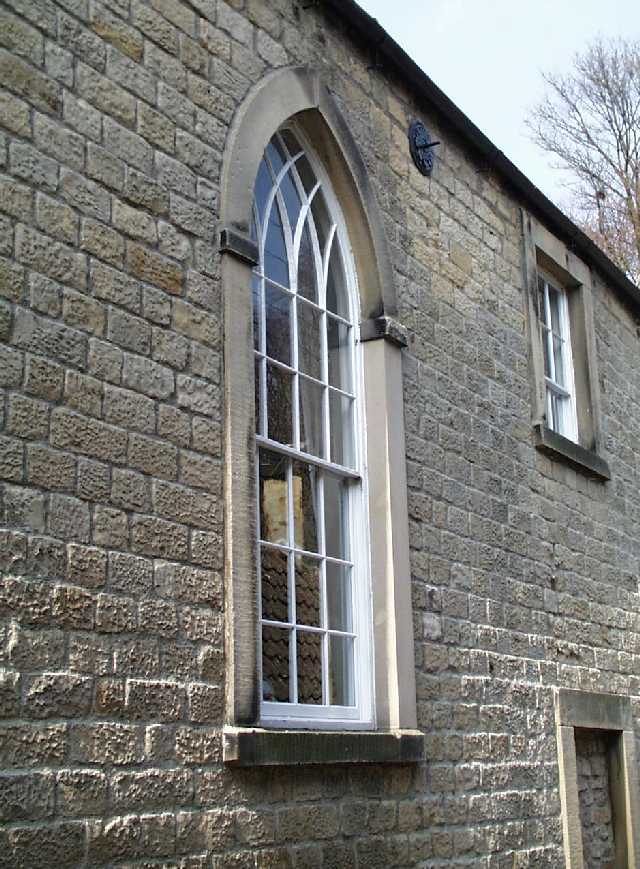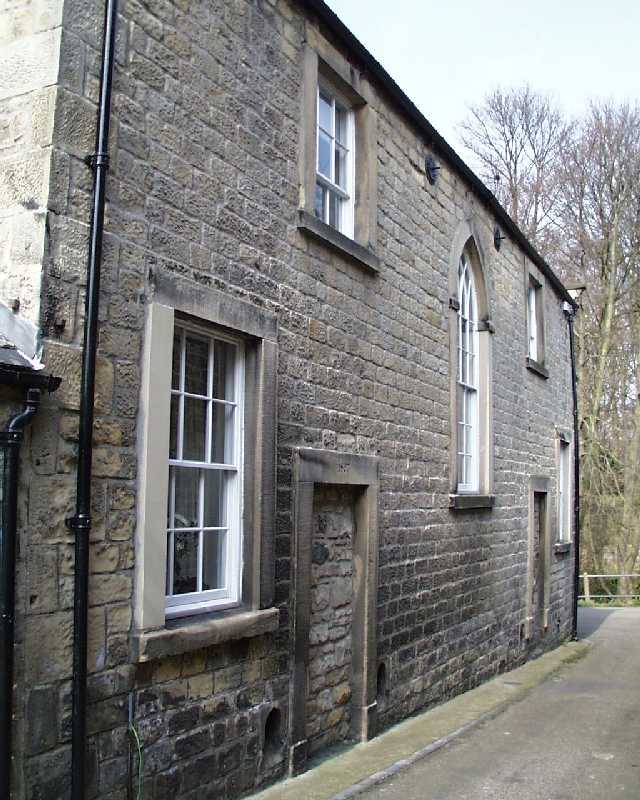 Former Congregational chapel, now workshop and store room. Dated 1827 on door surround. East elevation coursed squared sandstone, returns and rear rubble, with quoins and ashlar dressings; brick addition; roof of graduated grey slates with stone gable copings. One high storey, 5 bays. (6)