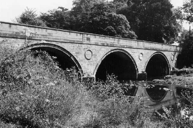 Canongate Bridge. Grade I listed building. 1821. Ashlar. Three river arches and one land arch at south end. Moulded hood moulds to arches; circular panel is in spandrels. Parapet wall curves at south end. (2)